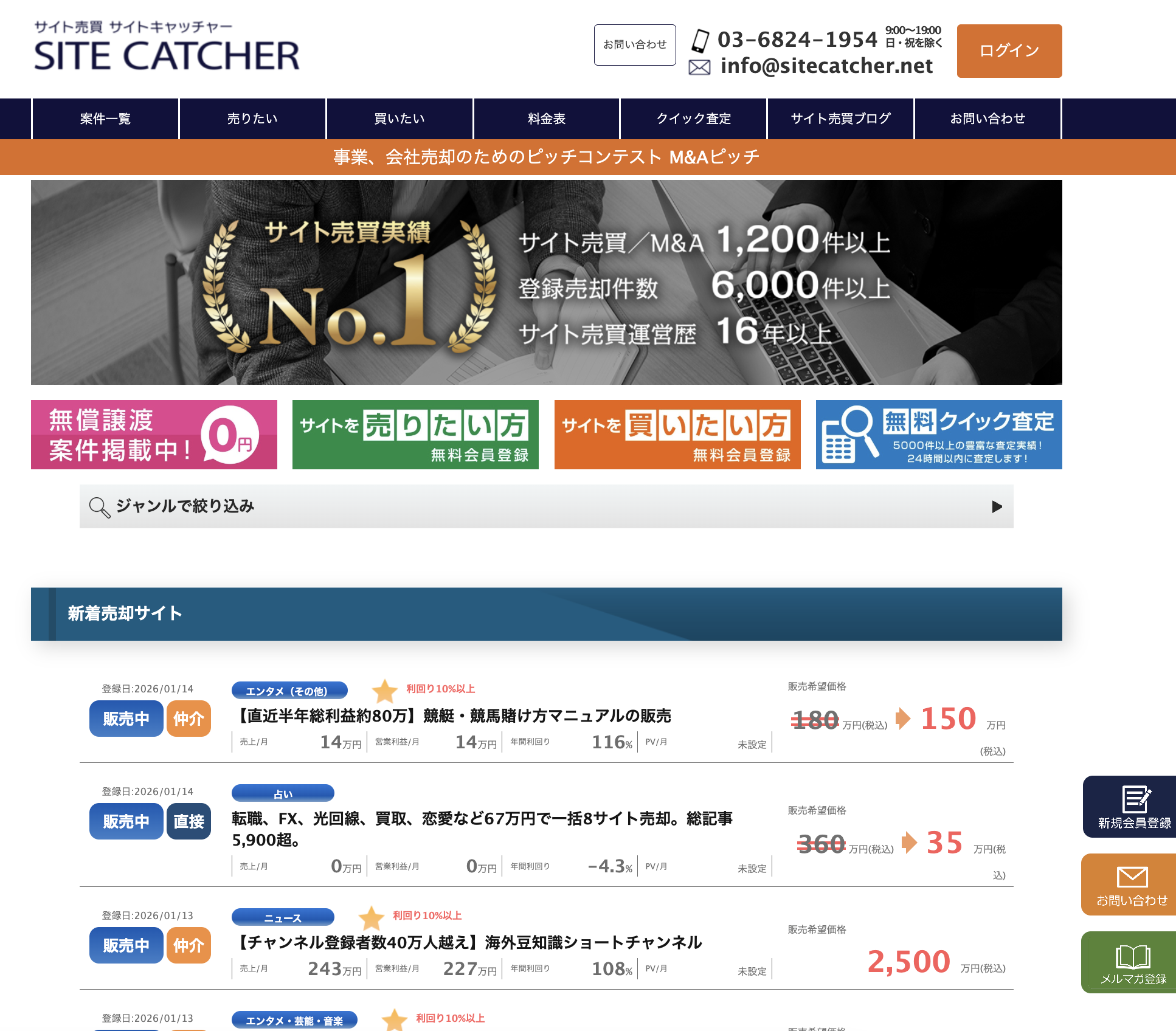 サイトキャッチャーは、個人ブロガーが安心してブログを売却できる実績豊富なサービスです。